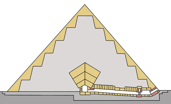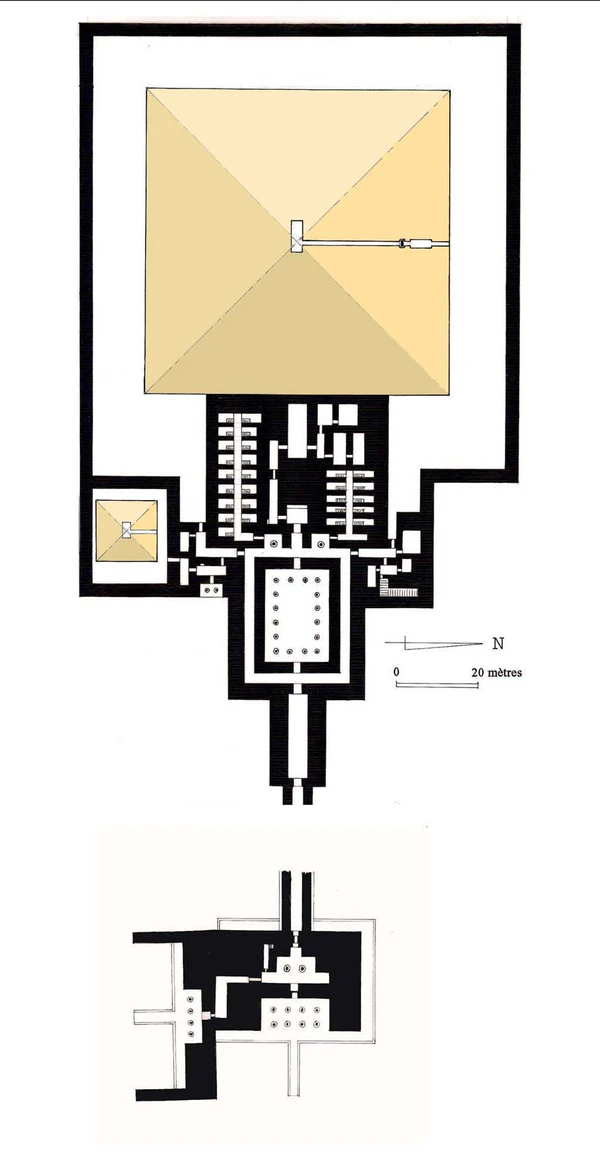 У восточной стороны пирамиды стояло его главное здание со святилищем и большим залом, потолок которого подпирали пятиметровые гранитные колонны с капителями в форме папирусов; помимо всяческих обрядовых помещений в ней находились часовня, в пяти нишах которой стояли статуи фараона, а также 27 кладовых, каждая из которых представляла собой настоящий сейф с гранитной дверью. Число статуй фараона в эпоху IV династии варьировалось, но оно стало каноническим во времена V династии.