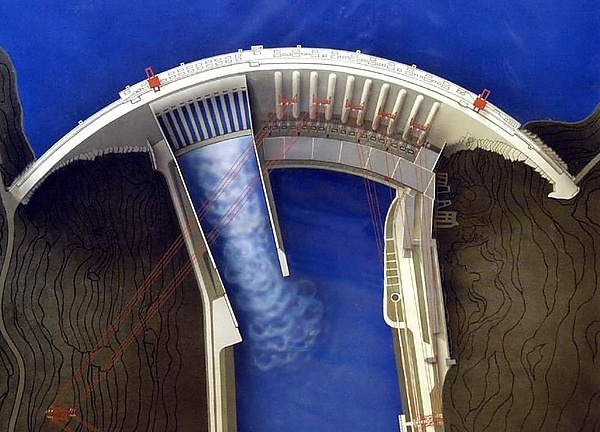 В 1962—1965 годах «Ленгидропроектом» велись активные работы в рамках разработки проектного задания Саяно-Шушенской ГЭС. В ходе проектирования рассматривались варианты компоновки будущего гидроузла с каменно-набросной, бетонной гравитационной, арочной и арочно-гравитационной плотиной. Из всех возможных вариантов наиболее предпочтительным оказался вариант с арочно-гравитационной плотиной (так, вариант с каменно-набросной плотиной, потенциально несколько более дешёвый, был отвергнут по причине необходимости строительства крупных тоннельных водосбросов, требовавших сооружения сложных в эксплуатации двухъярусных водоприёмников и создававших тяжёлый гидравлический режим реки в нижнем бьефе)[41]. Проектное задание Саяно-Шушенской ГЭС было утверждено Советом Министров СССР в 1965 году и предусматривало сооружение ГЭС с 12 гидроагрегатами мощностью по 530 МВт (с подводом воды по типу использованного на Красноярской ГЭС), расположенными в здании ГЭС, по центру арочно-гравитационной плотины, и двумя поверхностными водосбросами без водобойных колодцев слева и справа от здания ГЭС, предусматривавших гашение энергии потока воды в яме размыва в нижнем бьефе[42][43].