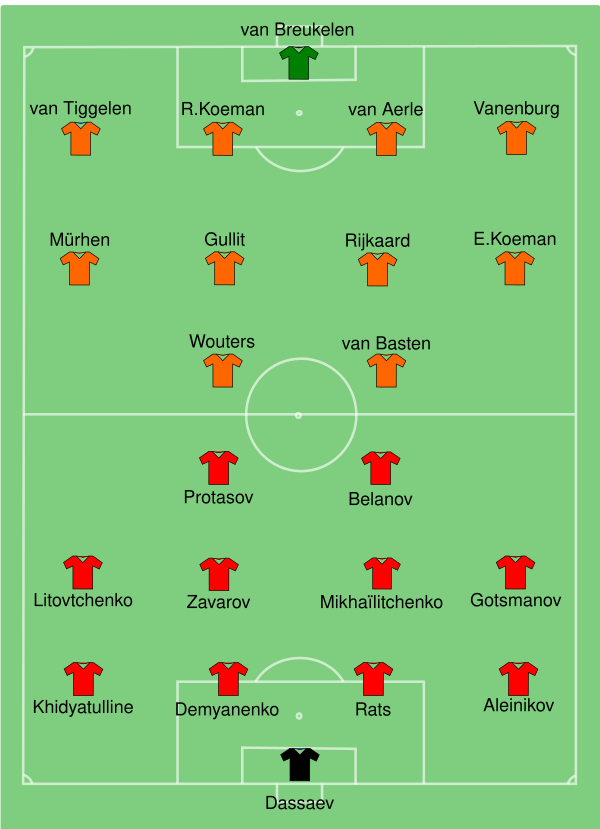 В тот день вся «Страна тюльпанов» вырядилась в оранжевое. 25 июня 1988 года на 70-тысячном «Олимпиаштадион» в Мюнхене собралось свыше 50 тысяч болельщиков сборной Нидерландов — они поддерживали своих любимцев в финальном матче чемпионата Европы против сборной СССР. Находясь в состоянии эйфории после победы 2:1 в Гамбурге над немцами, четыре дня спустя в Мюнхене болельщики нидерландцев поразили Европу плакатами с надписью: «На восьмой день Бог создал Марко». В финале «оранжевым» противостояла сборная СССР, обыгравшая Нидерланды со счётом 1:0 в матче группового этапа. К удивлению многих, подопечные Ринуса Михелса начали решающую встречу не слишком удачно. Тем не менее первым отличился капитан сборной Нидерландов Рууд Гуллит, немного успокоив товарищей по команде. На 30-й минуте Эрвин Куман подал угловой, Марко ван Бастен коснулся мяча, и тот отлетел к набежавшему Гуллиту, который мощнейшим ударом головой пробил Рината Дасаева — 1:0. Затем во втором тайме исход матча был блистательно решён «оранжевыми». 37-летний Арнольд Мюрен левой ногой отдал передачу на 50 метров ван Бастену, а легендарный нападающий с фактически нулевого угла поразил дальнюю «девятку» ударом с лёту, удвоив преимущество сборной Нидерландов. Этот гол по-прежнему считается одним из самых красивых, когда-либо забитых на таком уровне. В конце второго тайма произошёл ключевой эпизод игры. Голкипер Ханс ван Брёкелен организовал необязательный пенальти в свои ворота, предоставив Игорю Беланову отличный шанс переломить игру. Однако вратарь моментально исправился, отразив удар форварда киевского «Динамо» с «точки» и вдохновив партнёров. Тот поединок так и завершился со счётом 2:0. Нидерландцы наконец прервали 14-летнюю полосу неудач, в ходе которой они дважды уступали в финалах чемпионата мира. Из-за раздиравших команду изнутри конфликтов серьёзных успехов на мировых первенствах 1990 и 1994 годов и чемпионате Европы 1992 нидерландцам достичь так и не удалось, что породило разговоры о не полностью раскрытом потенциале, без сомнения, мощной дружины.