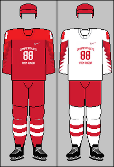 Традиционные цвета формы сборной России — белый, синий и красный — не менялись с 1992 года. Отличительные признаки — двуглавый орёл с гербом России и подпись «Россия» декоративным старославянским шрифтом. При этом дизайн формы постоянно менялся: до Олимпиады 2002 года на форме изображался герб Федерации хоккея России, со времён Олимпиады 2006 года на форме изображается государственный герб России. В 2018 году в связи с дисквалификацией Олимпийского комитета России на грудь был добавлен вместо герба России номер игрока с подписью «Olympic Athlete from Russia». В 2021 году похожая ситуация произошла на чемпионате мира, только на сей раз команда выступала с флагом ОКР на груди. Новый комплект был подготовлен к Олимпийским играм 2022, где однако сохранился флаг ОКР на белом фоне.
