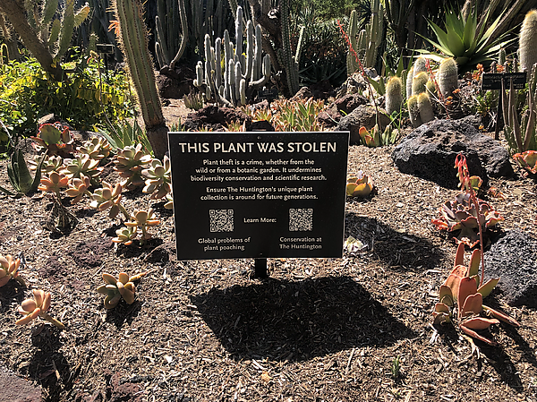 Кроме того, ботанические сады могут способствовать повышению осведомлённости о проблеме незаконного сбора растений[20]. В целях защиты растений от браконьерства в Саду пустыни, который находится на территории Библиотеки, художественного собрания и ботанических садов Хантингтона, была установлен специальный знак.