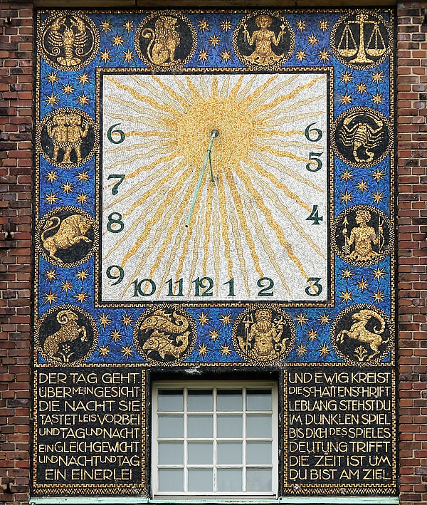 Слева под часами можно прочитать первую и последнюю строфы стихотворения Рудольфа Г. Биндинга (несколько изменённые)[4]: