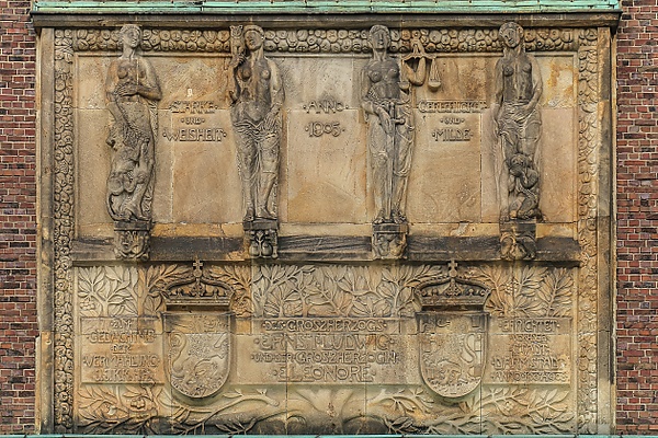 Стены башни выполнены из тёмно-красного кирпича. Над входом расположена плита из песчаника, изображающая четыре фигуры над двумя гербами. Фигуры являются олицетворением четырёх добродетелей правителя: силы, мудрости, справедливости и мягкости[2]. Барельеф плиты был разработан немецким скульптором Генрихом Йобстом[4]. Надпись на плите гласит[2]: