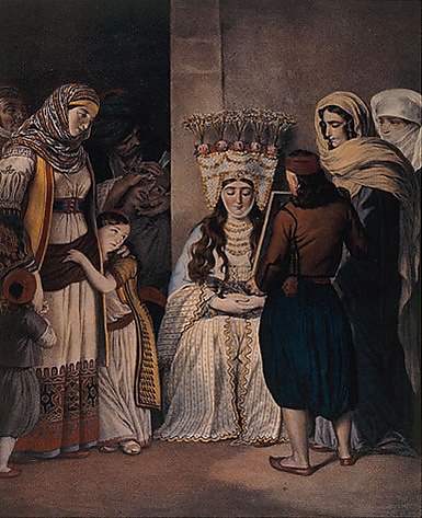 Характерная черта одеяния греческой невесты: голову украшают золотыми нитями, а лицо закрывают длинной розовой вуалью.