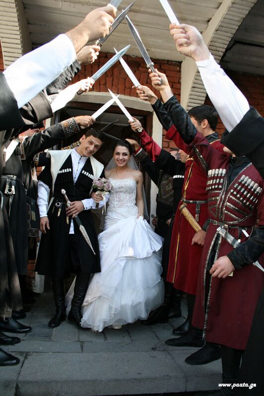 Важным моментом свадебного обряда считается вступление молодой жены в дом мужа. Каждое место, куда попадает новобрачная (двор, порог, дверной косяк, подножие лестницы, верхняя ступень лестницы) отмечаются особыми действиями её самой и прочих участников церемонии. Например, свекровь встречает её с хлебом и поясом, которые кладёт на порог. Молодая должна перешагнуть через них: если перешагивает правой ногой — это хорошая примета, левой — плохая. Перед входом в дом невеста трижды низко кланяется. Она рисует мёдом или маслом крестики на дверном косяке или на потолке, либо участники процессии вырезают их своими кинжалами[10].