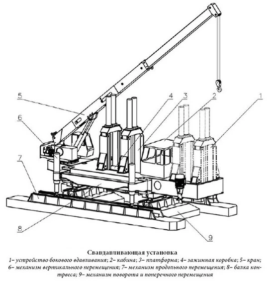 СВУ содержит в своей конструкции сваевдавливающий механизм с гидравлическим или канатным приводом и узлом зажима сваи, установленный на грузовую раму. В зависимости от конструкции, установка может быть оснащена шагающим или гусеничным ходовым устройством. В зависимости от базовой машины привод установки может быть многомоторным электрическим, дизель-электрическим или дизельным с гидравлической или групповой механической трансмиссией.