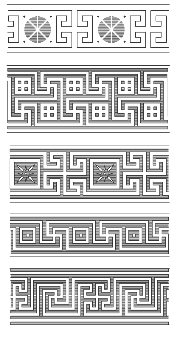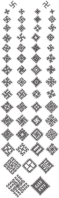 »)[8][7]. Исходя из теории симметрии свастика может рассматриваться не только в качестве розетки, но и как другие симметричные фигуры — бордюр и сетчатый орнамент, например, меандр («