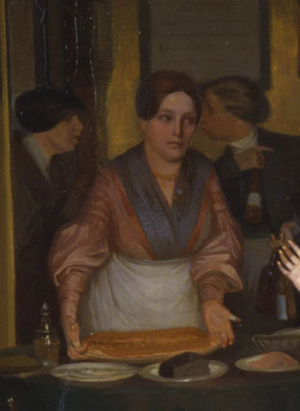 У левого края картины изображены второстепенные персонажи — кухарка, которая ставит на стол свежеиспечённую кулебяку, сиделец с бутылкой вина, которую он, по-видимому, принёс из винной лавки, а также с любопытством выглянувшая из соседней комнаты старуха-приживалка. Сиделец (приказчик, заменяющий хозяина торговой лавки на время его отсутствия) — молодой человек, одетый в купеческий кафтан, с расчёсанными на прямой пробор волосами. Держа в руках бутылку с вином, он повернулся к высунувшейся в дверь приживалке, по-видимому, объясняя ей, что происходит в доме[53]. Образ приживалки — старухи в повойнике — введён художником для того, чтобы показать каждодневный быт купеческой семьи, «с кучей приживалок и дальних родственников, слоняющихся по дому как бесплотные тени». Образы сидельца и приживалки Федотов писал с завсегдатаев Толкучего и Андреевского рынков, а кухарку — с прислуги хорошо знакомого ему семейства Флугов[54]. Искусствовед Галина Леонтьева полагает, что в «Сватовстве майора» кухарка является положительным образом женщины из народа, поскольку она — единственная из всех героев картины — понимает низость совершаемой сделки в разыгрываемой на её глазах комедии брака[55].