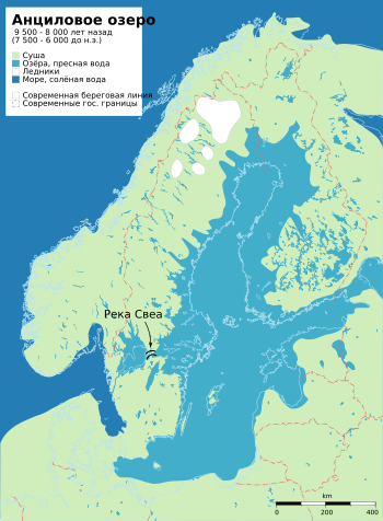 - ↑ В соответствии с современными представлениями о возрасте Анциловой трансгрессии[1]; в источниках, где упоминается река Свеа, оценки её возраста существенно ниже[2][3]