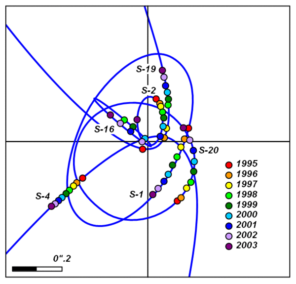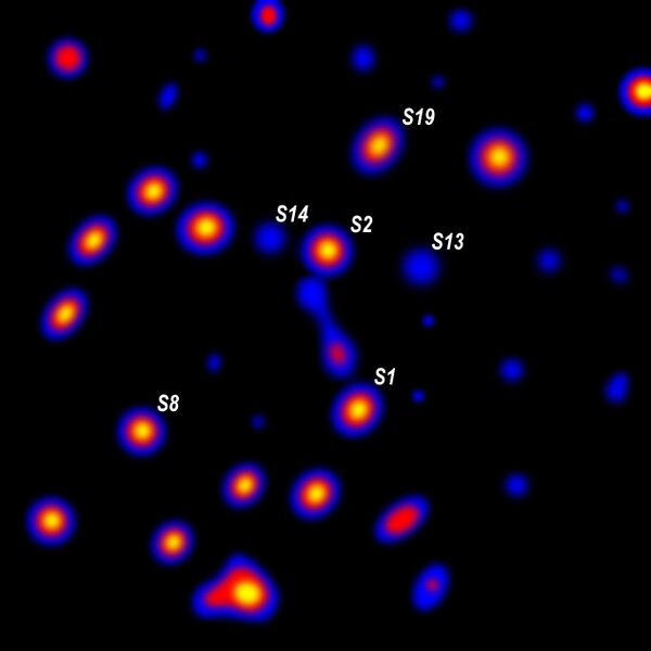 В 1993—1996 годах А. Экарт и Р. Генцель наблюдали движение отдельных звёзд в окрестностях центра нашей Галактики[16]. Наблюдения проводились в инфракрасных лучах, для которых слой космической пыли вблизи ядра галактики не является препятствием. В результате удалось точно измерить параметры движения 39 звёзд, находящихся на расстоянии от 0,13 до 1,3 светового года от центра галактики. Было установлено, что движение звёзд соответствует кеплеровскому, при котором центральное тело массой 2,5⋅106 масс солнца и радиусом не более 0,05 светового года соответствует положению компактного радиоисточника Стрелец-А (Sgr A).