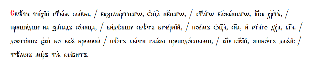 Свѣ́те ти́хїй ст҃ы́ѧ сла́вы, / безсме́ртнагѡ, ѻ҆ц҃а̀ нбⷭ҇нагѡ, / ст҃а́гѡ бл҃же́ннагѡ, і҆и҃се хрⷭ҇тѐ, / прише́дше на за́падъ со́лнца, / ви́дѣвше свѣ́тъ вече́рнїй, / пое́мъ ѻ҆ц҃а̀, сн҃а, и҆ ст҃а́го дх҃а, бг҃а. / досто́инъ є҆сѝ во всѧ̑ времена̀ / пѣ́тъ бы́ти гла́сы прпⷣбными, / сн҃е бж҃їй, живо́тъ даѧ́й: / тѣ́мже мі́ръ тѧ̀ сла́витъ.
