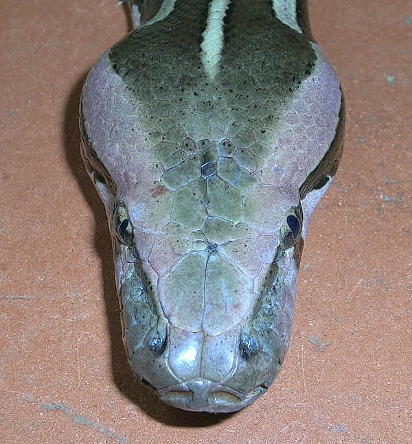 Отличается от тёмного тигрового питона (Python molurus bivittatus) следующими признаками: