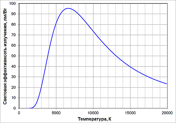 Величина световой эффективности излучения АЧТ определяется его температурой. При относительно низких температурах излучение АЧТ располагается главным образом в инфракрасной области спектра. Затем, при повышении температуры, максимум спектрального распределения излучения смещается сначала в видимую область, а затем и далее, в ультрафиолетовую. Результатом этого является немонотонное поведение температурной зависимости эффективности излучения АЧТ и наличие у неё максимума. Следует отметить, что даже в максимуме световой КПД излучения АЧТ невелик, составляя лишь 14 %.