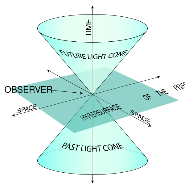 Поскольку никакой сигнал не может распространяться быстрее света, световой конус имеет прямое отношение к причинно-следственной структуре пространства, а именно, он разделяет всё пространство-время на три части по отношению к вершине: область абсолютного прошлого (конус прошлого; все события, которые могли повлиять на событие в вершине), область абсолютного будущего (конус будущего; все события, на которые влияет событие в вершине конуса) и область абсолютно удалённого (события, отделённые от вершины пространственноподобным интервалом, то есть не связанные с вершиной причинно-следственными связями). Уравнение светового конуса с вершиной в начале отсчёта зависит от пространства-времени, и имеет особенно простой вид в пространстве Минковского: