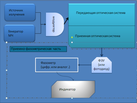 Приёмопередатчик фазового светодальномера состоит в общем случае из следующих элементов: источника излучения, модулятора излучения, генератора модулирующей (масштабной) частоты, передающей и приёмной оптических систем и приемно-фазометрической части, включающей в себя приёмник излучения, аналоговый или цифровой фазометр и оконечное индикаторное устройство. В качестве источника излучения используются, за редким исключением, либо газовый лазер на смеси гелий неон (Не Ne), излучающий в красной области спектра (длина волны излучения А,= =0,63 мкм), либо светодиод на арсениде галлия (GaAs), излучающий в ИК области (А,=0,9 мкм)[8].
