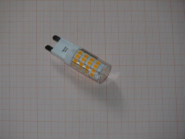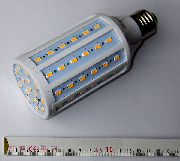 - Лампа-«кукуруза». Собирается из нескольких плат в форме многогранной призмы, на каждую плату устанавливается несколько маломощных светодиодов, сверху может накрываться колпаком из оргстекла с отверстиями для охлаждения. По форме такая лампа напоминает кукурузный початок. Лампы-«кукурузы» дают более всенаправленную диаграмму распределения света, и потому не требуют крупногабаритных рассеивателей. Как правило в лампах-кукурузах светодиоды плохо охлаждаются, отчего быстро теряют яркость или выходят из строя.