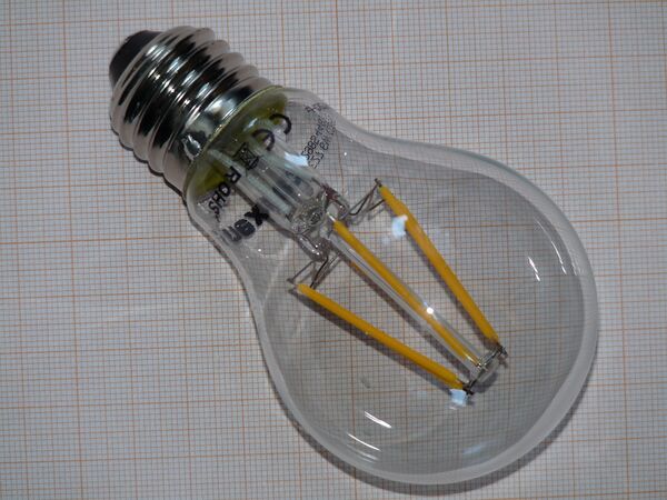 - Филаментные лампы — внешне похожи на ранние лампы накаливания, благодаря чему могут использоваться в декоративных светильниках, рассчитанных на прозрачные лампы накаливания. В таких лампах светодиоды выращиваются на стеклянной подложке, соединяются последовательно в группы, как правило по 28 светодиодов, что позволяет упростить драйвер, так как одна такая «нить» питается напряжением около 100 вольт — благодаря этому не требуется преобразование напряжения, достаточно лишь ограничения тока и выпрямления. С другой стороны, места для преобразователя и радиаторов охлаждения в таких лампах очень мало. В дешёвых филаментных лампах используются простейшие выпрямители даже без сглаживающих конденсаторов.