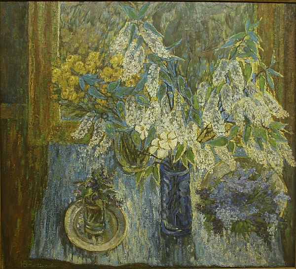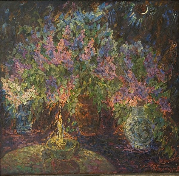 Композиция натюрморта построена вокруг трёх букетов цветов, размещённых на тёмной плоскости с фиолетовыми, розовыми и голубыми бликами. В центре картины расположен крупный раскидистый букет сиренево-голубых и фиолетовых цветов в высоком коричневом кувшине. Справа находится меньший по размеру букет в круглой светлой вазе, а у левого края — небольшой букет розово-белых цветов в прозрачном кувшинчике. На переднем плане слева изображена часть срезанной круглой плоскости, на которой стоит зелёная чаша с высокой горящей свечой. Фон картины выполнен в почти чёрных тонах с голубыми вкраплениями, в правой верхней части изображён маленький белый месяц. В работе преобладают сложные сочетания оттенков, что придаёт особое значение цветовой гамме произведения.