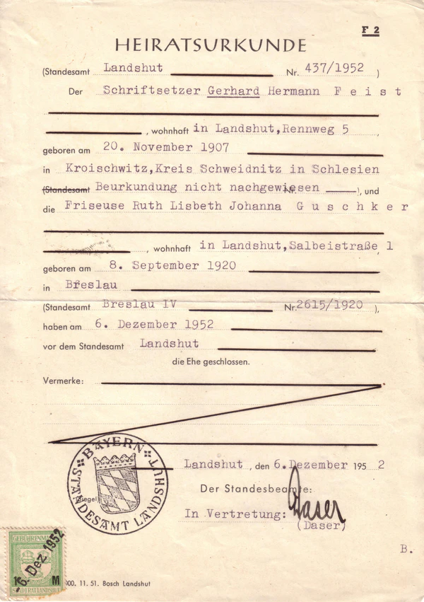 - Имена и фамилии супругов, место и дата рождения, а также правовая принадлежность супруга к религиозной общине, при условии, что членство следует из регистрационной записи;