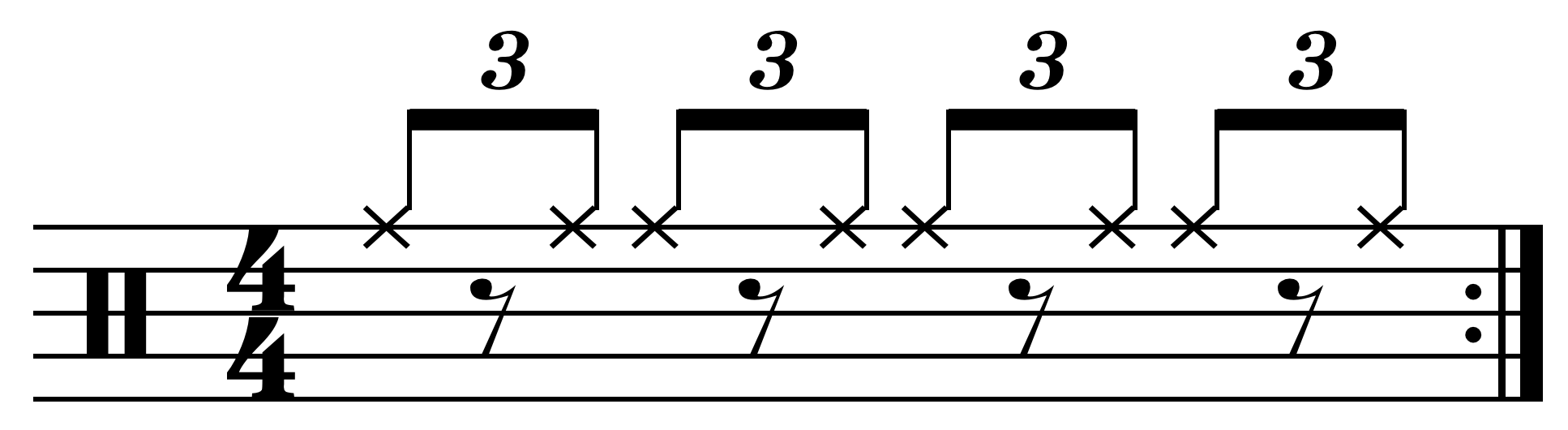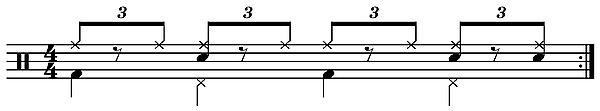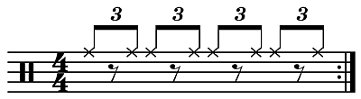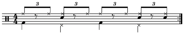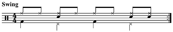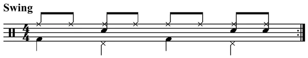 Бас-барабан и малый барабан в начале эры свинга были основными держателями времени, малый барабан использовался для подводящих долей или акцентов на второй и четвёртой. Вскоре выяснилось, что хай-хэт может добавить новое измерение свингу, если играть им двухдольную фигуру «ти-цшш-Ш», где «ти» — подводящая к «цшш» на первой и третьей долях, а «Ш» — акцент на второй и четвёртой.