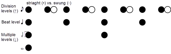 В свинговом ритме пульсация делится неравномерно, так что определённые подразделения (обычно восьмые или шестнадцатые ноты) чередуются по длительности: одна длиннее, другая короче. В музыке эпохи барокко и классицизма встречается техника notes inégales, аналогичная свингу. В шаффл-ритме первая из двух нот может быть вдвое (или более) длиннее второй. В свинговом ритме соотношение длительностей первой и второй нот может варьироваться: часто первая нота вдвое длиннее второй, что создаёт ощущение триолей, но на практике это соотношение менее определённо и часто гораздо тоньше[8]. В традиционном джазе свинг обычно применяется к восьмым нотам. В других жанрах, таких как фанк и джаз-рок, свинг часто применяется к шестнадцатым[9].