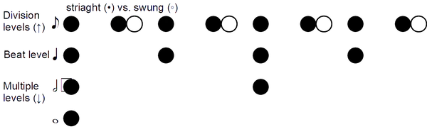 В большинстве джазовых произведений, особенно эпохи биг-бендов и позднее, акцентируются вторая и четвёртая доли такта 4/4, а ритм строится на парах «подводящая — основная доля» (да-ДУМ, да-ДУМ...). «Да» предвосхищает, или ведёт к, «ДУМ». Подводящая доля может быть не слышна, но иногда акцентируется для фразировки или динамики.