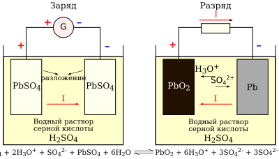 Во время разряда происходит восстановление диоксида свинца на катоде[4][5] и окисление свинца на аноде. При заряде протекают обратные реакции. При перезаряде аккумулятора, после исчерпания сульфата свинца, начинается электролиз воды, при этом на аноде (положительный электрод) выделяется кислород, а на катоде — водород.