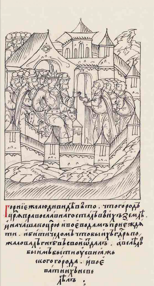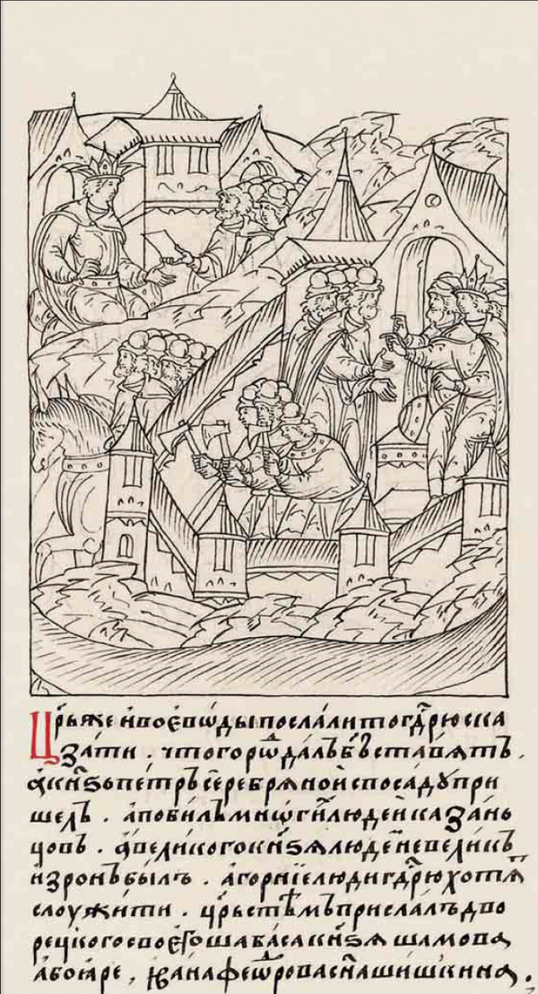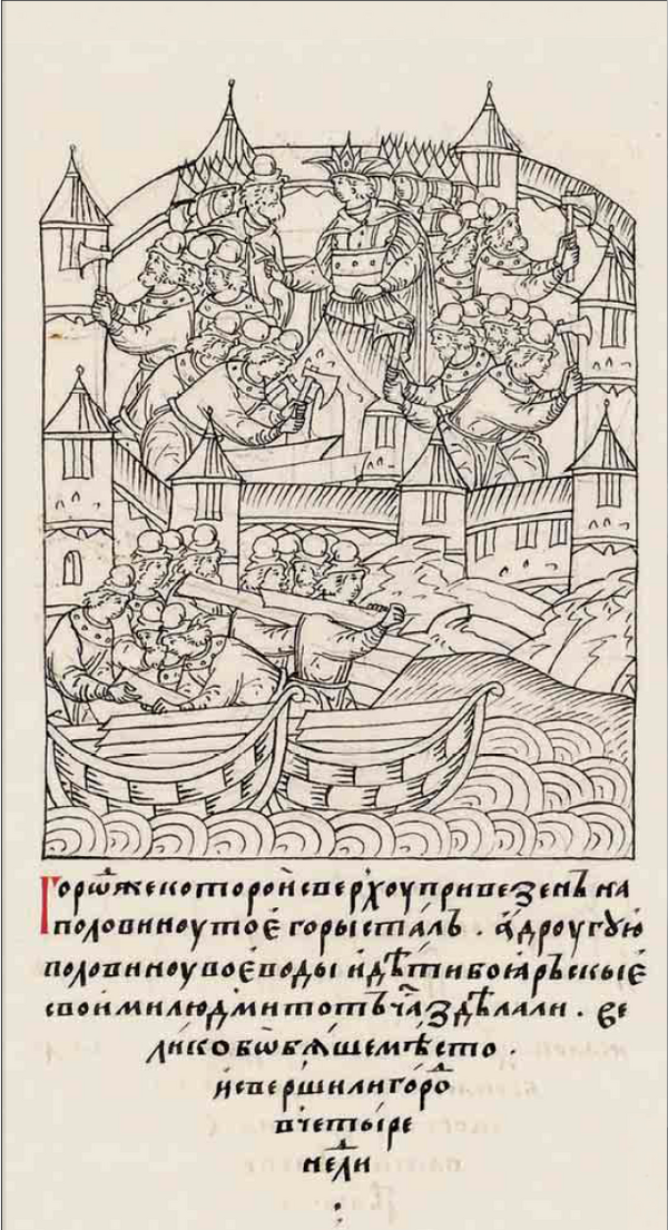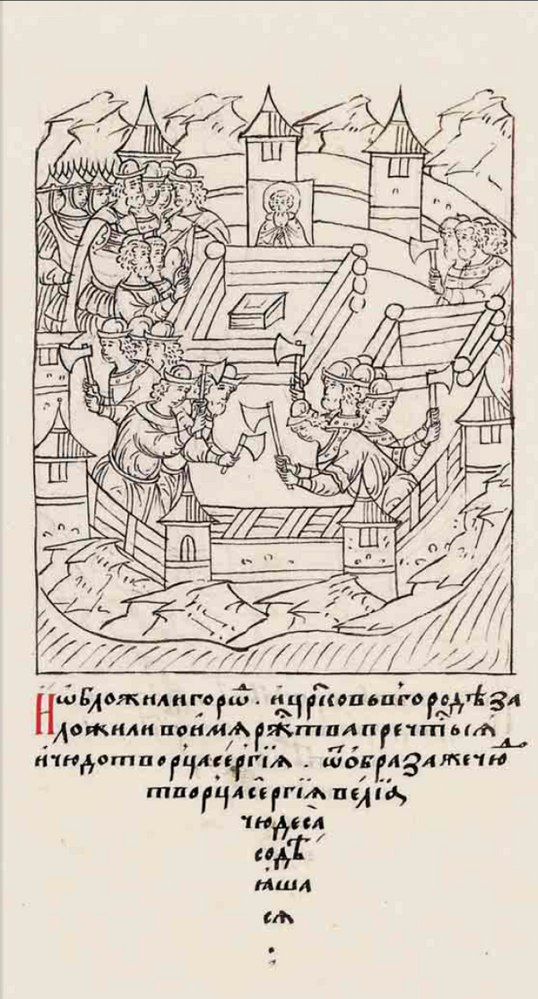 Великий князь приказал срубить город с деревянными стенами, башнями, воротами, как настоящий город; а балки и бревна переметить все сверху донизу. Затем этот город был разобран, сложен на плоты и сплавлен вниз по Волге, вместе с воинскими людьми и крупной артиллерией. Когда он подошел под Казань, он приказал возвести этот город и заполнить все [укрепления] землёй; сам он возвратился на Москву, а город этот занял русскими людьми и артиллерией и назвал его Свияжском