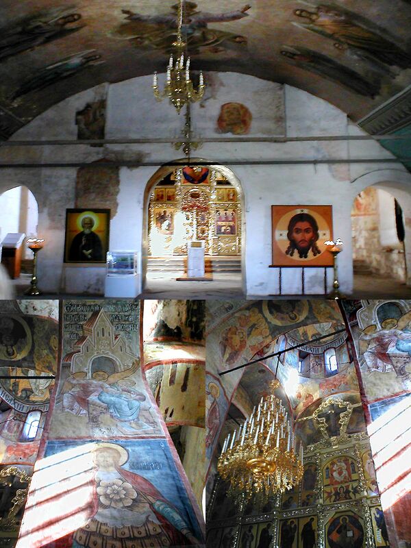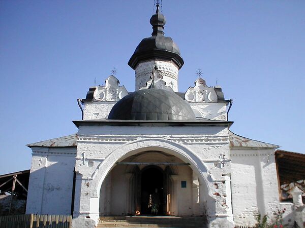 - Сергиевская церковь (конец XVI — начало XVII века)[32]. Возведена из белого камня-известняка в конце XVI – начале XVII вв. на месте деревянной церкви, дошла до наших дней перестройками XVII – XVIII вв. В 2010-е гг. была проведена комплексная реставрация здания: расчистка фасадов, реставрация стен и сводов; купола колокольни, главки и закомар четверика и пр. На восточном фасаде в верхней части выявлен фрагмент наружной росписи – композиция «Троица Новозаветная» (тип «Отечество»).