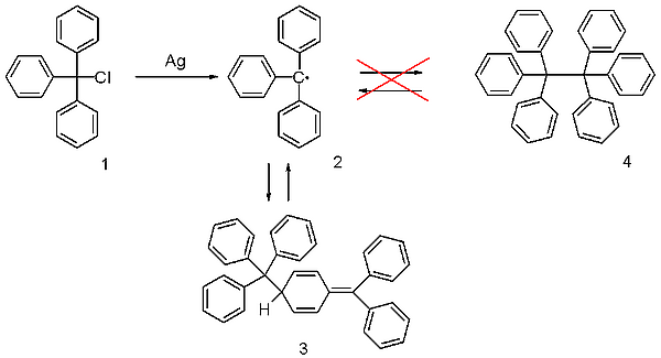 В растворах эти радикалы существуют в равновесии с молекулами-димерами. На положение этого равновесия, то есть на соотношение радикала и димера, влияет сольватация, а также электронные и пространственные эффекты. Первоначально считалось, что димеры имеют структуру гексаарилэтанов, но позже было показано, что они имеют хиноидную структуру.