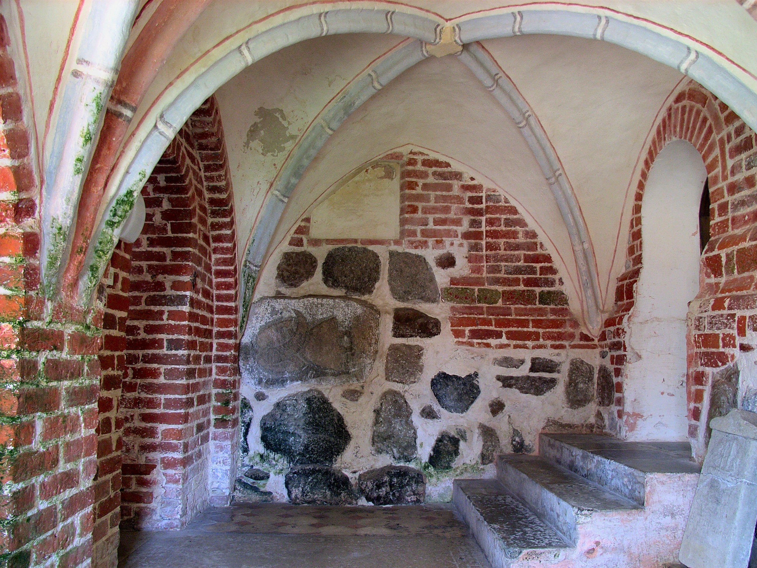 Предполагаемое изображение бога Святовита, камень из святилища Арконы в стене церкви села Альтенкирхен на острове Рюген[3][4]