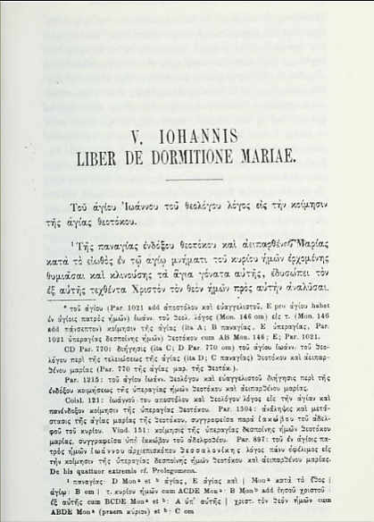 Апокриф «Святого Иоанна Богослова сказание об успении Святой Богородицы» — наиболее распространенный среди греческих апокрифов о Успении, сохранилось около 100 рукописей. Впервые сочинение на основе двух рукописей: Monacensis gr. 66 и 146 издал Франсуа Ксавье Эмабль Бергер (François Xavier Aimable Berger) в 5 томе сборника «Beyträge zur Geschichte und Literatur, vorzüglich aus den Schätzen der Königl» в 1805 году в Мюнхене. Константин Тишендорф в Лейпциге в 1866 году в сборнике «Apocalypses apocryphae. Mosis, Esdrae, Pauli, Ioannis item Mariae Dormitio.» издал сочинение, используя 5 рукописей: Parisinus gr. 1173, Marcianus gr. II. 42, Monacensis gr. 276, Ambrosianus gr. A 60 и C 921. На русский язык сочинение переведено и издано в 1873 году, в апрельском номере журнала «Православное обозрение». Автор перевода — священник И. Смирнов.