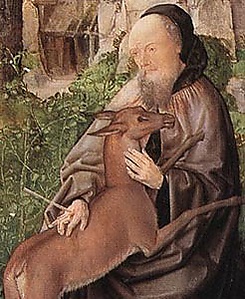 | Атрибуты | стрела, посох, отшельнический скит, олень |