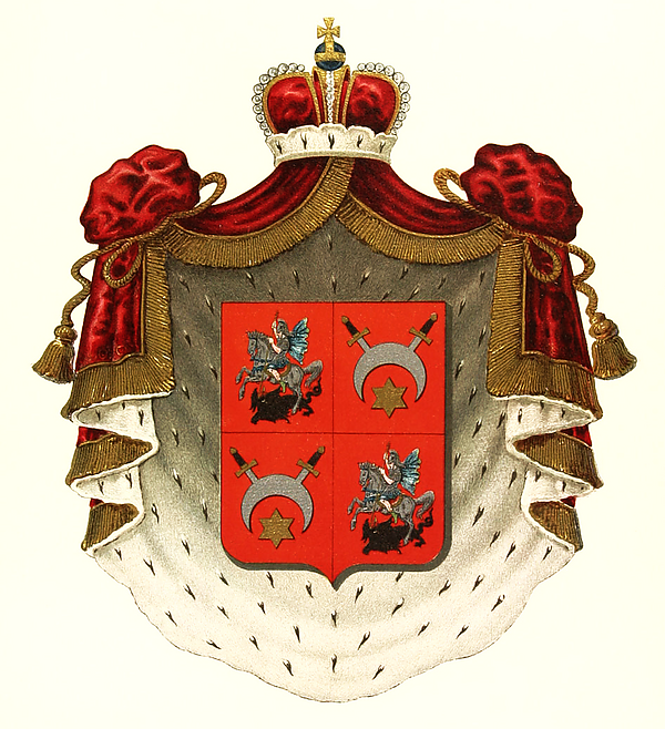 - Древний герб князей Святополк-Четвертинских: в червлёном поле святой Георгий Победоносец на белом коне, поражающий чёрного дракона. Щит подрыт княжеской мантией и российской княжеской шапкой.