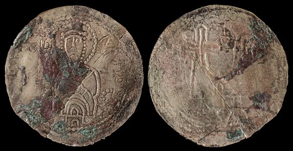 В Киеве Святополк успел выпустить сребреники (известно 50 таких монет[7]), похожие на сребреники Владимира. Сребреник Святополка Владимировича чеканили в 1015—1016 гг. Монета весит чуть менее 3 грамм и имеет диаметр около 29 мм. На лицевой стороне изображение князя с круговой надписью: «Святополк на столе [престоле]». На обратной стороне: княжеский знак в виде двузубца, левый конец которого завершается крестом, и надпись: «А се его серебро». На некоторых монетах Святополк именуется своим христианским именем Петрос или Петор.