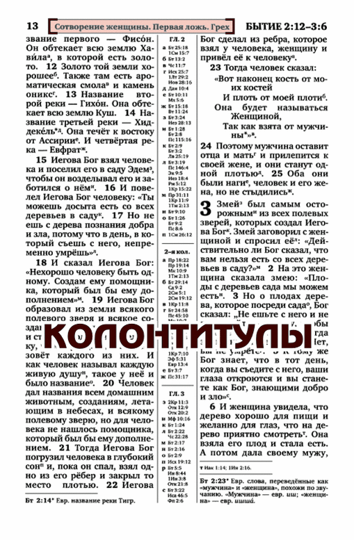Колонтитулы. Для того, чтобы облегчить поиск необходимых мест Библии в «Переводе нового мира» почти на каждой странице верху расположены колонтитулы, в которых кратко упоминается о содержании страницы[21].