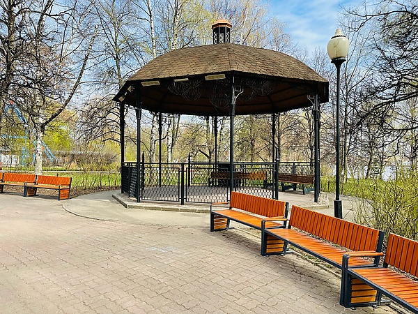 В парке проложены пешеходные аллеи, стоят лавочки для отдыха. Территорию освещают фонари, работающие от солнечных батарей. Для проведения мероприятий оборудована сцена.