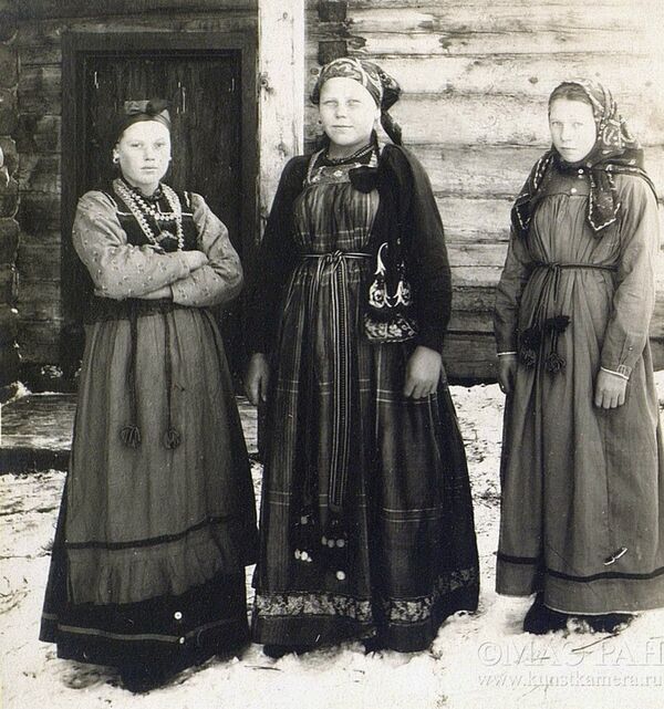 Женский севернорусский костюм дольше сохранял свои особенности. Поверх длинной рубашки из белого холста с поликами на севере носили сарафан (длинную плечевую безрукавную одежду), который подпоясывали тканевым поясом. По праздникам замужние женщины носили твёрдые головные уборы, богато украшенные вышивкой, парчой, жемчугом — кокошники и венцы. В будние дни носили повойник (небольшую шапочку с завязками) и платок[42].