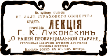 — Вологодский листок. «Лекция Г. К. Лукомского». 1913[49].