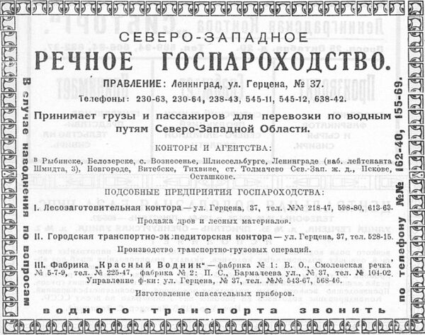 В соответствии с Постановлением Совета труда и обороны от 30 января 1923 года было образовано Северо-Западное государственное речное пароходство(СЗРП) с правлением в Петрограде. Первым председателем правления госпароходства стал И. Сундуков, директором СЗ ГРП Шишкин. СЗУРП ведал водным транспортом Вологодской, Архангельской, Новгородской, Ленинградской областей и юго-западной части Карелии, обслуживая пассажирские и грузовые линии.