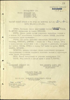 11-я армия — штаб и Военный совет армии, по ряду данных, пленен или погиб. Немцы захватили шифрдокумент. 5, 33, 188, 128-я стрелковые дивизии неизвестно в каком состоянии и где находятся. Много отставших и убежавших, задерживаемых направлении Двинск. Много брошено оружия. 11-я армия не является организованным боеспособным соединением.