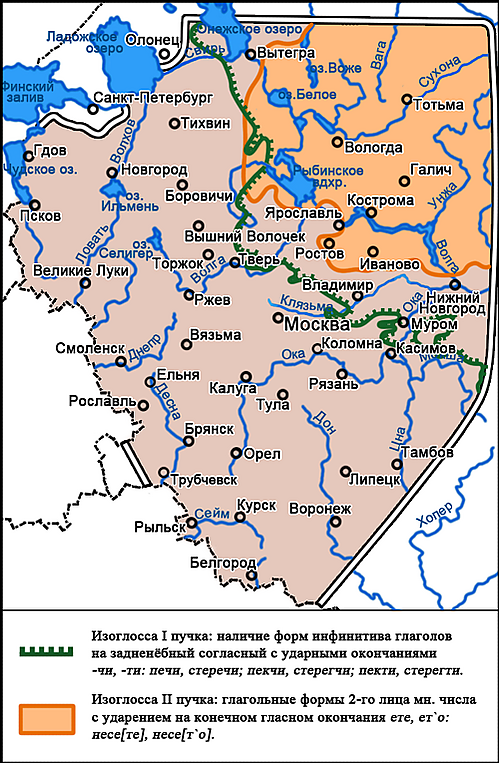 Одними из наиболее ярких явлений, характерных для говоров I пучка изоглосс данной зоны, являются: Распространение таких слов, как мост (сени), бо́льно наряду с менее распространённым словом ши́бко (очень)[8]; местоимение 3-го лица в форме именительного пад. мн. числа оне́, в говорах северной части диалектной зоны сосуществует с формой они́, отсутствует в Онежской группе говоров. Произношение слов: внук с начальным м — [м]нук (отсутствует в северной части диалектной зоны); кукушка с предударным гласным о — кок[у́]шка; а также произношение нерегулярно распространённых слов: [де́р']гат' (дёргать), [л’о]шш или [л’о]ш’ш' (лещ), [д’о́]ржим (держим) и др. Употребление форм инфинитивов с конечным ударным -и от основ на задненёбный согласный: печи́, стеречи́ или пекчи́, пекти́, стерегчи́, стерегти́ и т. п. (см. изоглоссу на карте) (такие же формы инфинитивов распространены в юго-западной части западных среднерусских акающих говоров) Также к диалектным явлениям I пучка изоглосс относят: Исключительное распространение форм инфинитива с суффиксом -ти глаголов типа нести́, везти́, идти́ (такие же формы инфинитивов исключительно распространены в части западных среднерусских говоров, на других территориях употребляются формы типа нест' , везт' наряду с нести́, везти́). Распространение разрозненными ареалами инфинитивов кла́сти, ходи́ти. Нерегулярно распространённое явление употребления предлога по с винительным пад. неодушевлённых и одушевлённых существительных в конструкциях с целевым назначением: пошёл по орехи, пошёл по топор и т. д.[1]