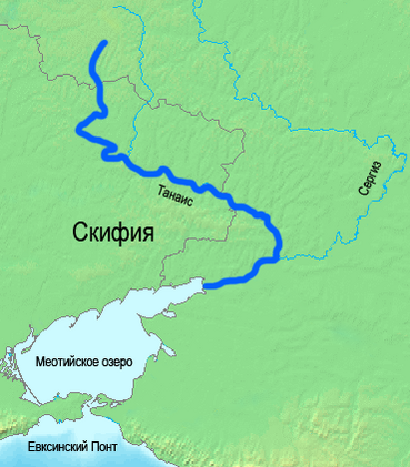 С этого же времени появляются первые письменные источники о бассейне Северского Донца. Геродот неоднократно упоминает Северский Донец и скифов в Истории, однако как у Геродота, так и впоследствии в русских летописях с названиями Дон и Донец систематически возникает путаница. По-видимому, в то время часто считали основной рекой Северский Донец вместе с 218-километровым участком Дона до впадения в Азовское море, а сам Дон лишь её притоком. Таким образом, Северским Донцом иногда (ошибочно) считается Сиргиз (др.-греч. Σύργις), а иногда Танаис (др.-греч. Τάναϊς)[13][16]. Названия Дон, Донец и Танаис по распространённой версии происходят от скифского (древне-иранского) «дану» — река[10]. Сторонники славянского заселения бассейна приводят другую этимологию от имени славянского божества «Дана-Тана»[14].