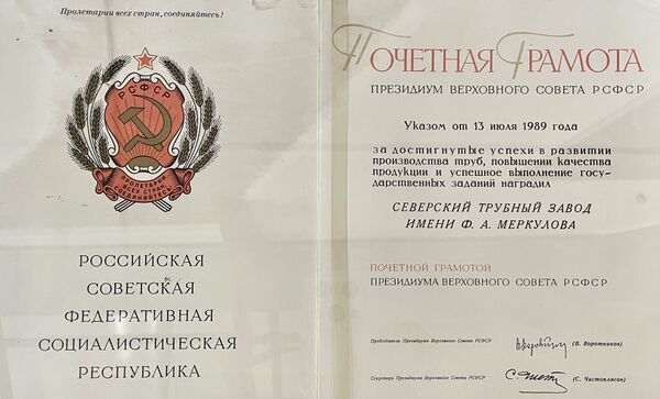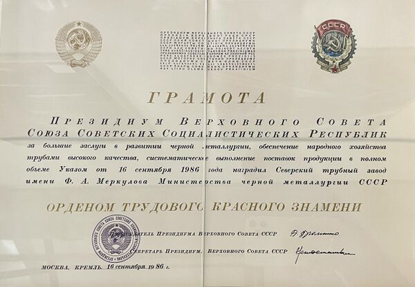 В 1986 году за большие заслуги в развитии чёрной металлургии и обеспечение народного хозяйства трубами высокого качества Северский трубный завод был награждён орденом Трудового Красного Знамени.