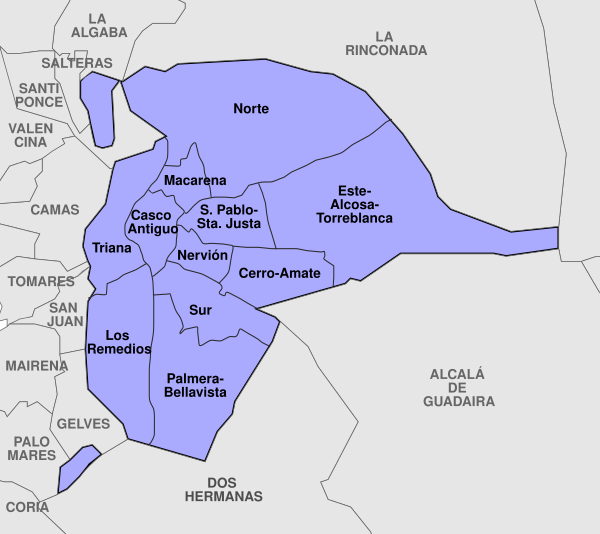 В административном плане Севилья разделена на 11 районов (исп. distritos): Бельявиста-Ла-Пальмера, Лос-Ремедиос, Макарена, Нервьон, Северный, Сан-Пабло-Санта-Хуста, Серро-Амате, Каско-Антигуо, Триана, Эсте-Алькоса-Торребланка, Южный, которые, в свою очередь, разделены на подрайоны (исп. barrios).