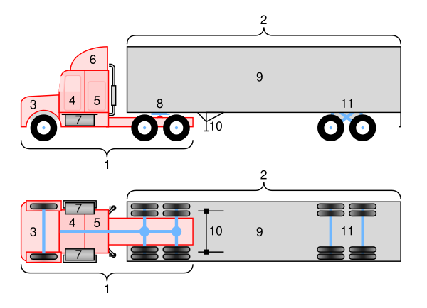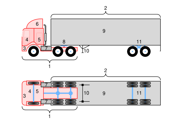 | Тягачи европейского типа чаще всего имеют 2 моста, три и более — гораздо реже. | Американские чаще всего имеют 3 моста, 2 из которых ведущие. |