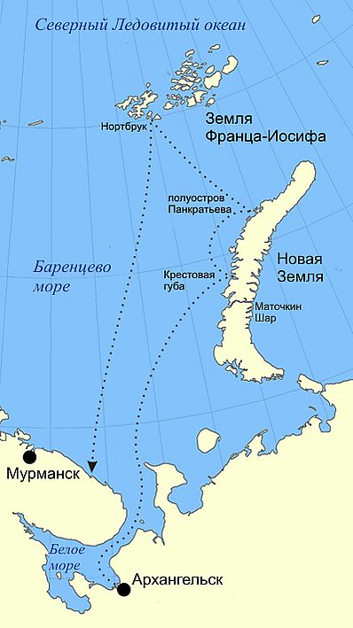 По пути судно попало в шторм, потеряло две шлюпки и часть размещённого на палубе груза[24]. Предвидя вероятную зимовку, Седов, в своём донесении начальнику Главного гидрографического управления от 28 августа 1912 года, просил организовать доставку угля для экспедиции, но просьбу оставили без последствий[30]. Во время остановки у поселения Ольгинское в бухте Крестовая губа на Новой Земле ещё 5 членов экипажа списались с судна и остались дожидаться рейсового парохода, который подходил к становищу два раза в год.