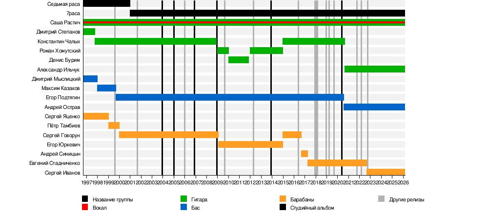- Саша Растич (настоящие имя и фамилия — Александр Сечёных) — вокал, гитара, основной автор песен (1996—наши дни)