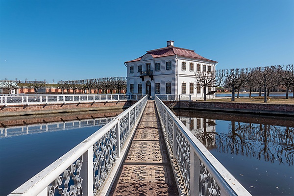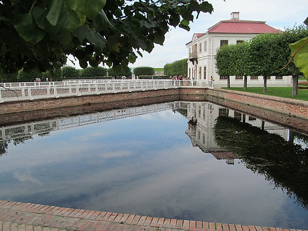 Пруд был проточным, он получал воду из нагорного ручья и фонтанов. На сектора его делили три арочных моста, стены были сделаны из голландского кирпича, вдоль них с 1757 года шла железная балюстрада (архитектор Я. Алексеев). Мосты были вымощены кирпичом, перилами служили узорчатые железные решётки[2]. Предположительно решётки делали те же мастера, что создали ограждение балконов Петергофского дворца; узор создают сравнительно просто изогнутые прутья, которые можно рассмотреть и как отдельные балясины, и как сплошной узор[1] (такая же решётка была сделана у Головинской дачи на Чёрной речке, подобные узоры встречались и в других местах[3]).