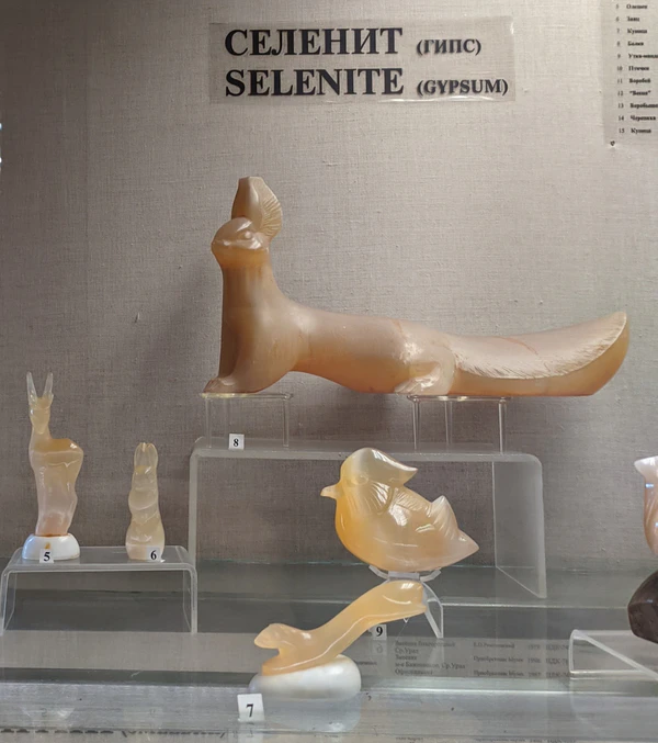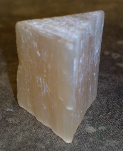 Селенит — разновидность гипса, имеющая шелковистый блеск и красивый переливчатый оптический эффект на полированной поверхности благодаря параллельно расположенным и плотно сросшимся между собой тонким волокнам.